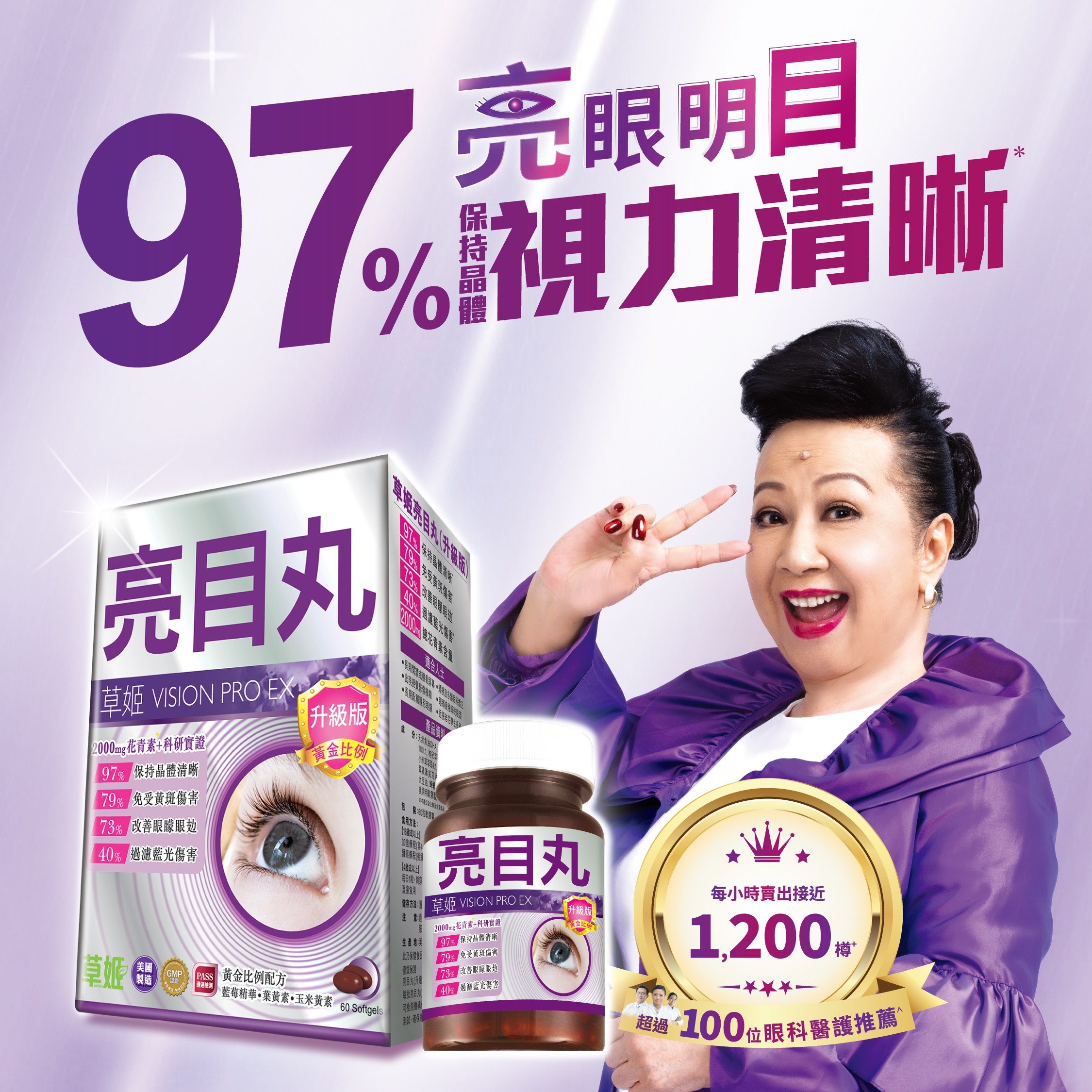 【草姬亮目丸(升級版) 】含註冊視光師、營養師推薦護眼成分,超過100位眼科醫護推薦>,再配合321中西護眼黃金比例配方,總花青素總含量更高達2000mg★,全方位補充眼睛營養,97%保持晶體視力清晰*,79%免受黃斑傷害^‧改善眼矇*,適合4歲或以上人士服用。