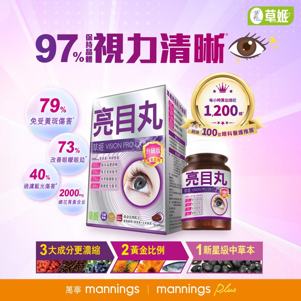 手机、平板计算机的屏幕都会释出有害蓝光,长时间看着电子屏幕,无论大人、小朋友都会加速眼退化,令眼睛出现红筋、酸涩,更有可能造成眼蒙问题,这些都是眼睛响起嘅健康警号,要及早注意眼睛是否有足够营养保护!【草姬亮目丸(升级版) 】每小时卖出接近1,200樽+,产品含眼科医生、注册视光师、营养师推荐护眼成分,超过100位眼科医护推荐>,再配合321中西护眼黄金比例配方,总花青素总含量更高达2000mg★,全方位补充眼睛营养,97%保持晶体视力清晰*,79%免受黄斑伤害^‧改善眼蒙*,适合3岁或以上人士服用。