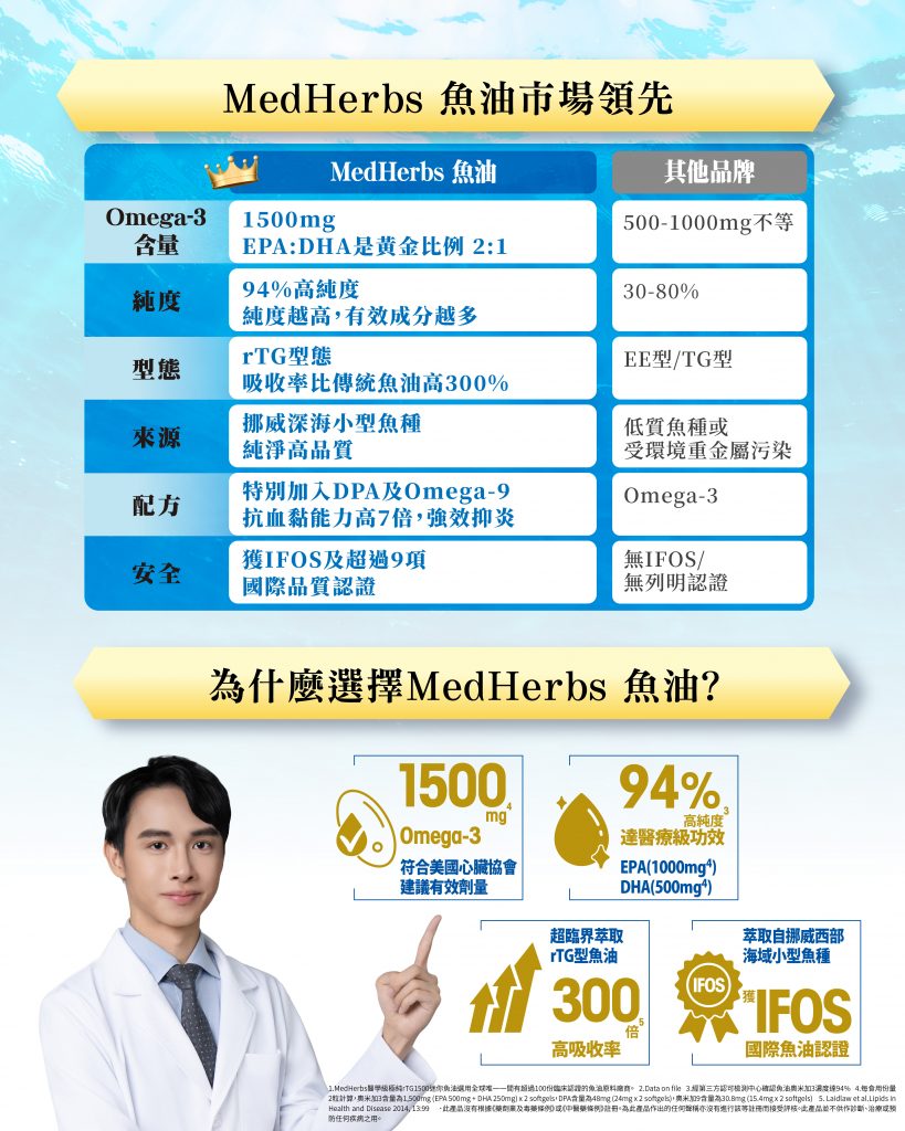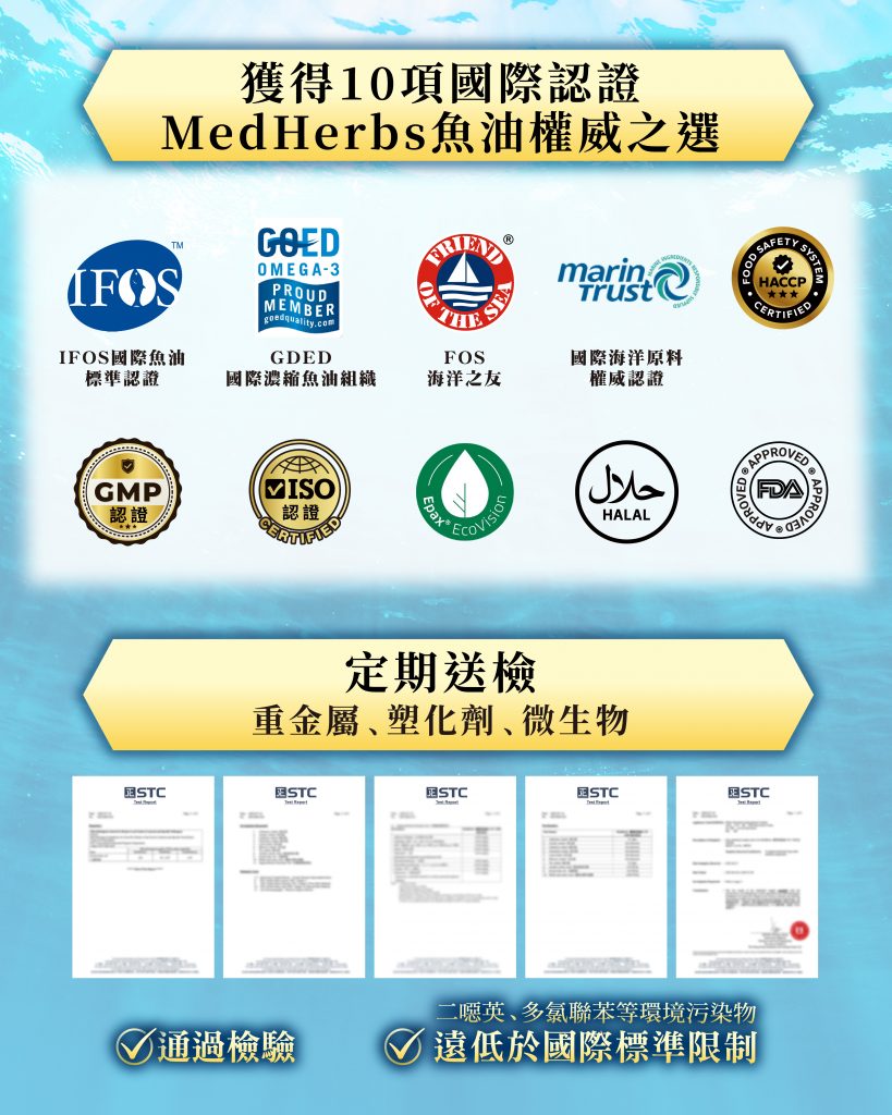 MedHerbs極純迷你魚油,由醫藥級廠房生產 1500mg含量達Omega-3 魚油,94%高純度達至國際醫療級功效,rTG型態魚油高達300%吸收率。 MedHerbs採用市場上罕有「DHA+EPA+DPA」配方,特別加入Omega-9,比一般Omega-3更有效抑制炎反應。萃取自挪威西部無污染海域的小型鳳尾魚,魚油獲得IFOS認證以及多項項國際認證。1.5cm迷你膠囊容易服用,無腥味,且不引起打嗝。