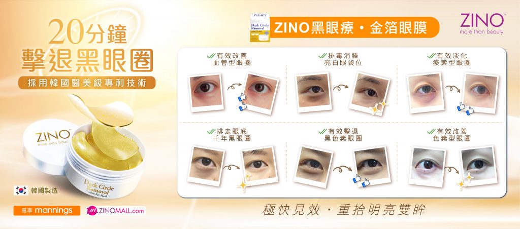 ZINO黑眼療·金箔眼膜是針對亞洲人黑眼圈特質設計的高效密集護理眼膜,採用韓國醫美級技術配方,融合頂級奈美金箔、鱘魚子精華和多重專利成分,能夠迅速撃退多種黑眼圈成因,令雙眼回復明亮有神。