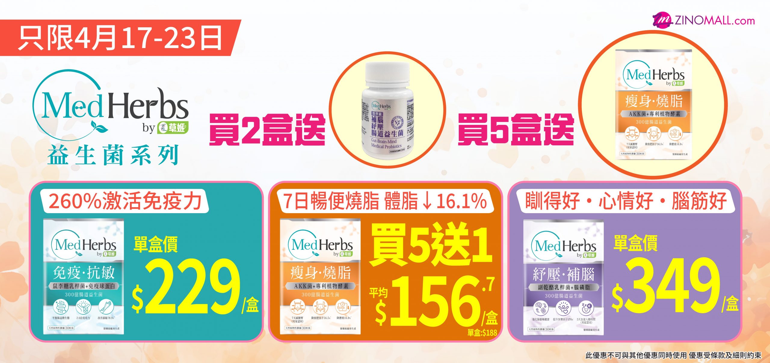 2. MedHerbs醫學級瘦身燒脂腸道益生菌 單盒優惠價:$188 優惠價: 平均$156.7/盒(買5件送1件價 原價:$340)