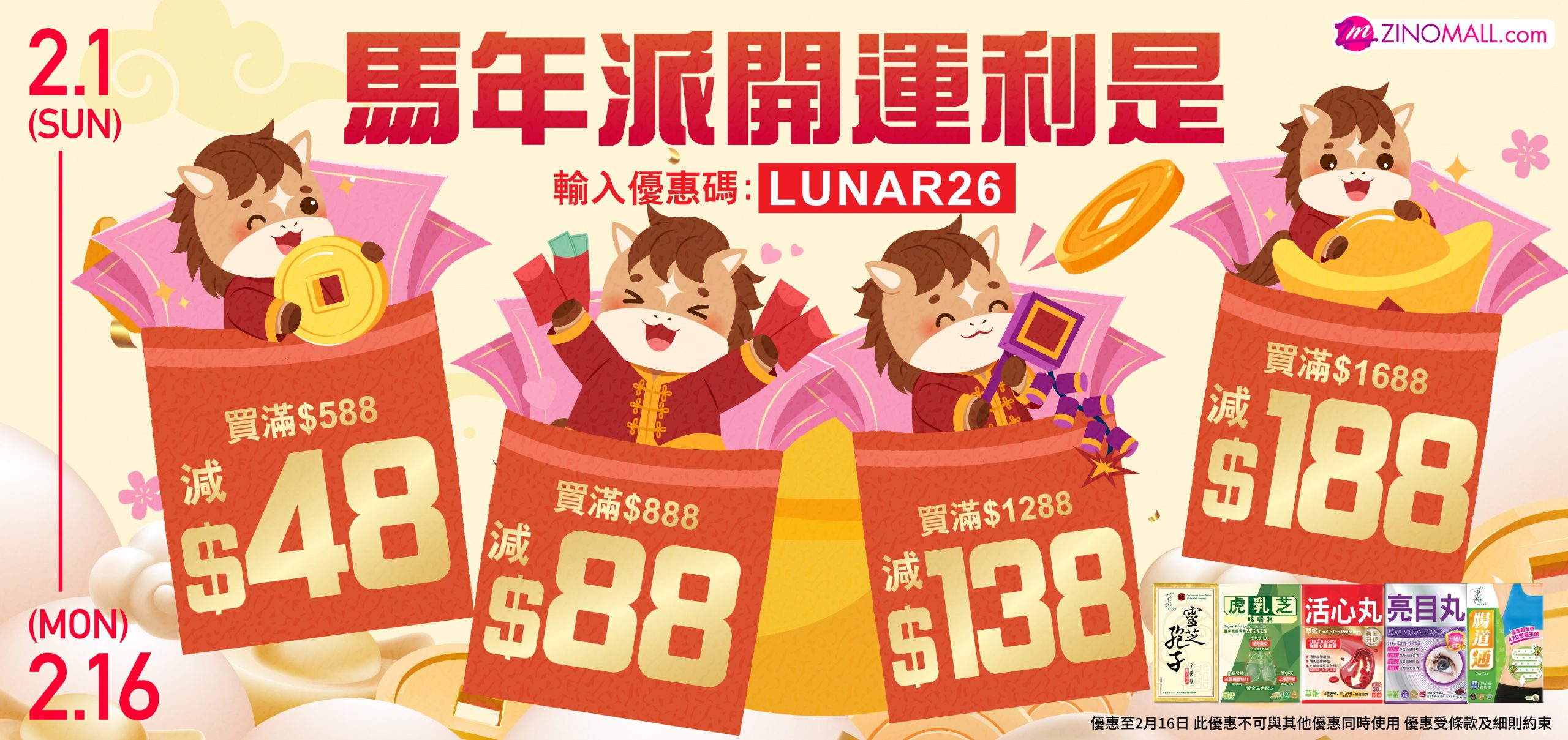 ✅輸入優惠碼【LUNAR26】 : 買滿$588即減$48;買滿$888即減$88;買滿$1288即減$138;買滿$1688即減$188