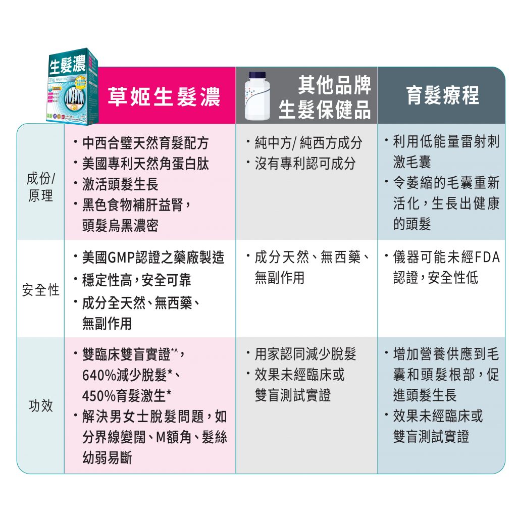 | 類型 | 草姬生髮濃👑 | 其他品牌生髮保健品 | 育髮療程 |